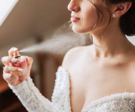 The,Brunette,Bride,,Holds,Perfume,In,Her,Hands,,Wants,To