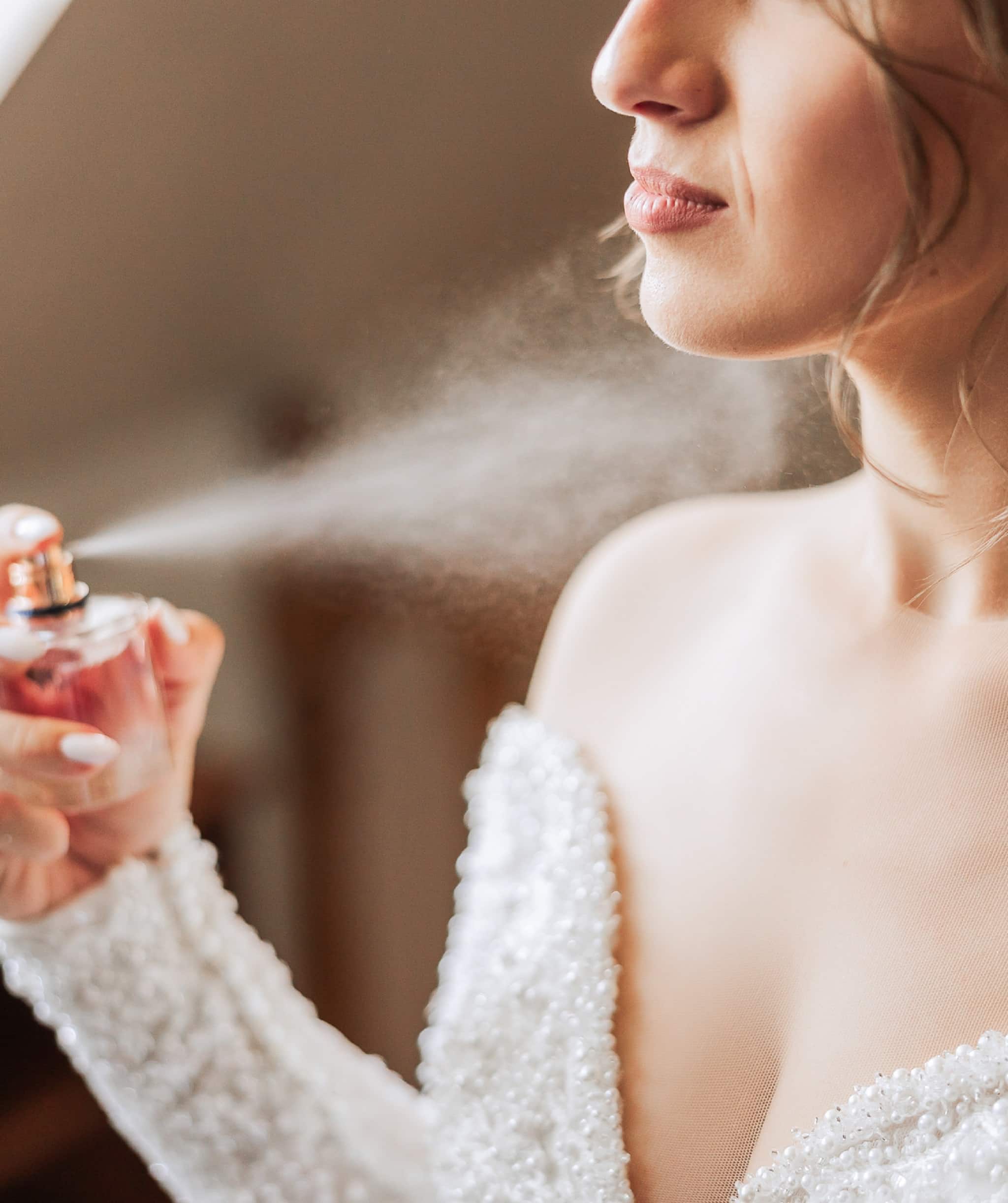 The,Brunette,Bride,,Holds,Perfume,In,Her,Hands,,Wants,To